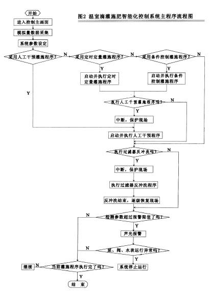 营养液施肥控制方式也分为人工干预、定时定量、条件控制 种。当进行营养液施肥时,计算机系统根据选定的配方和已设定好的营养液pH、EC值,利用文丘里注肥器进行水肥混合,同时在线实时监测混合营养液的pH、EC值,根据pH、EC设定值与检测值之间的偏差来调整混肥阀的注肥频率,在短时间内使营养液的检测值和设定值之差达到允许的范围内。当一组田间阀门施肥结束时.先打开下一组阀门,再关闭正在运行的阀门。当所有需要施肥的田间阀施肥完毕,先关闭施肥泵和水泵,再关闭正在打开的所有阀门,结束施肥控制。