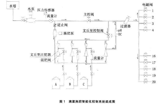 滴灌施肥智能化控制系统由中心控制计算机、系统首部装置、田间电磁阀和控制电缆、滴灌管网系统组成。系统组成见图1。