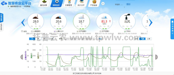 传感器实时传输土壤温度、土壤水分、空气温湿度、风速风向、光照强度等数据到智慧农业云平台,用户可随时查看数据及相应生成的报表,无论您在何地,都可以实时看到基地的动态。
