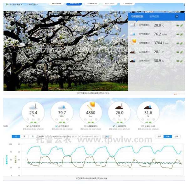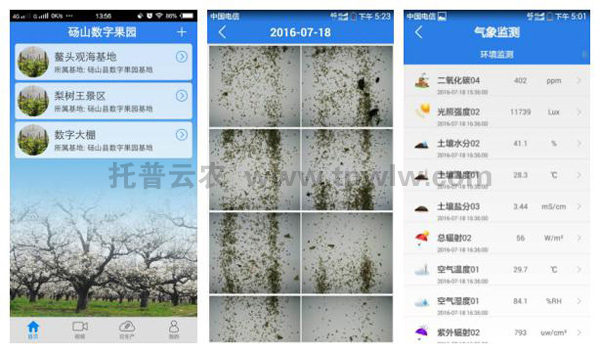 托普云农综合管理云平台涵盖“数字果园”生长环境数据采集系统、视频远程可视化系统、多功能预警系统、农产品质量安全追溯系统、中央指挥系统、手机APP等。