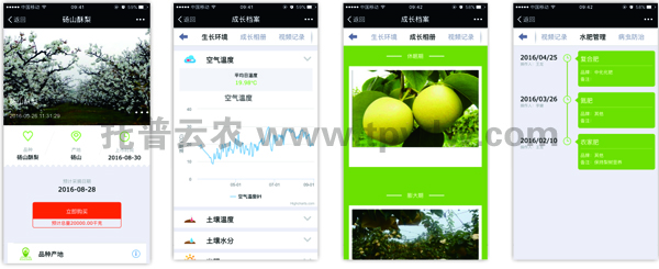 砀山“数字果园”的托普云农综合管理平台还嵌入了农产品质量安全追溯系统,实现“从农田到餐桌”的全程可追溯化管理。该系统是区域农产品质量安全信息统一发布和查询平台,根据农产品“一物一码”标准,消费者可以扫描农产品上附带的而为买,准确了解农产品从生产、加工、物流、仓储、销售等全过程信息。
