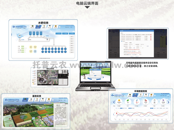 ?????? 可在托普智慧农业云平台选择地块、作物、传感器等信息,日、周、月查看监测数据,也可设置作物生长环境参数安全阀值,高于或低于设置时系统会自动预警;远程设置水肥任务的时间、次数;远程查看温室内的视频信息,实时掌握温室内的苗情、灾情信息;可根据采集的温室环境信息,形成数库,为合理安排农事工作、专家库建设提供数据模型;后台可对种植品种生成二维码,一键追溯生长环境信息、施肥施药信息、成长相册、检测报告等,实现对作物品种的全程可追溯;可接入专家系统,可为基地种植人员提供水肥精准化管理、病虫害绿色防控等农技指导、诊断与交流,保障农业高产高效。?