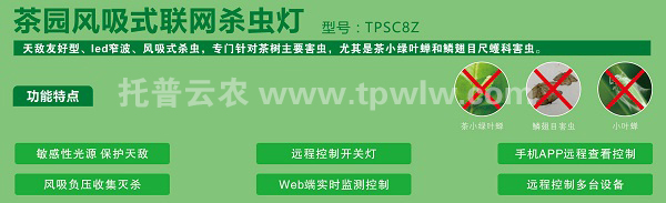 ? ? 托普茶园专用杀虫灯利用光近距离、波远距离引诱害虫成虫扑灯,主要诱杀茶园中的叶蝉、金龟以及众多的鳞翅目害虫,利用LED窄波,保护天敌。设备独有的远程控制功能可在GIS地图在线查看区域内杀虫灯工作状况、开关灯情况、设备预警,无需跑到茶园管理,该设备的引入,提高了古丈县茶园绿色管控水平,为促进古丈县茶叶产业持续快速发展,为茶农增收、茶叶提质提供了有效途径。