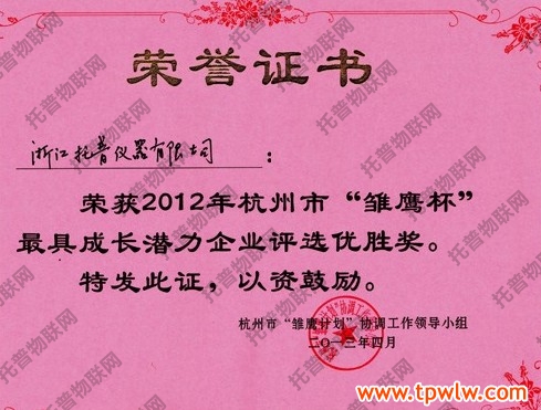 应杭州市科学技术委员会邀请,昨日下午于浙江省广电总局演播室,公司总经理陈渝阳参加了“2012年杭州市‘雏鹰杯’最具成长潜力企业“评选总决赛及颁奖典礼。浙江托普仪器有限公司荣获“雏鹰杯”最具成长潜力企业12强殊荣。
