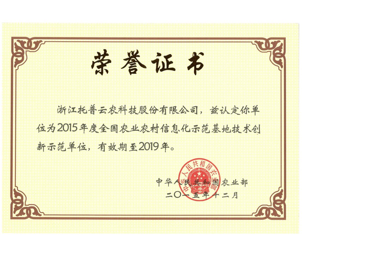 2015年12月9日,农业部发文公布《农业部关于认定2015年度全国农业农村信息化示范基地的通知》,浙江托普云农科技股份有限公司获批技术创新型示范单位?!锻ㄖ芬蟾魇痉痘?,秉持创新、协调、绿色、开放、共享的发展理念,积极推进“互联网+”现代农业行动,大力发展农业,切实抓好农业电子商务、农业物联网、农业农村大数据、农业信息服务等重点工作,大胆探索创新,充分发挥示范引领作用,为推进农业现代化作出新贡献。