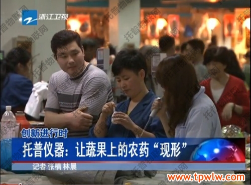2013年5月22日晚,浙江新闻联播报道了杭州市万寿亭农贸市场一位用农药残留速测仪检测自己所卖蔬菜的摊主以及农药残留速测仪的研发及生产厂家——浙江托普仪器有限公司。