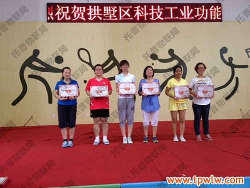 傍晚时分,比赛进入尾声,大赛评委为一众选手打分排名。托普仪器参赛团队获得团体奖第四名,公司参赛员工王秀芳获得那字单打第五名,诸葛远兵获得男子单打第六名,大赛举办方对获奖选手进行了嘉奖。图为:得奖选手台上合影