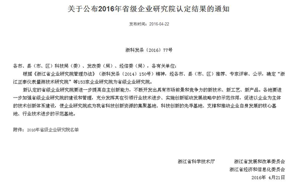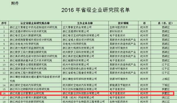 4月22日,浙江省科技厅公布了2016年“省级企业研究院”名单,经省内各市、县(市、区)推荐、专家评审、公示,确定“托普云农智慧农业研究院”等153家企业研究院为省级企业研究院。