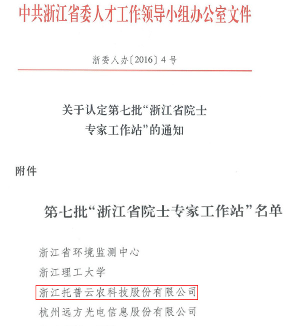 7月25日,中共浙江省委人才工作领导小组办公室公布了第七批“浙江省院士专家工作站”名单,此次共有22家单位上榜,杭州市2家。浙江省托普云农科技股份有限公司(以下简称“托普云农”)成为浙江农业信息化领域内第一家获此殊荣的企业。
