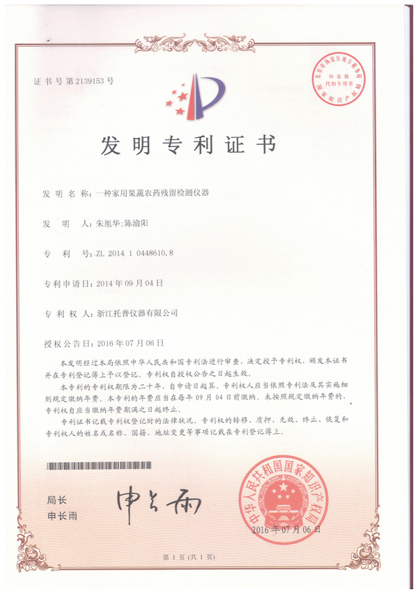 ?? ? ? 浙江托普云农科技股份有限公司(股票代码:833692)申请的“一种家用果蔬农药残留检测仪器”发明专利申请,已于2016年7月6日获得中华人民共和国国家产权局颁发的发明专利证书。