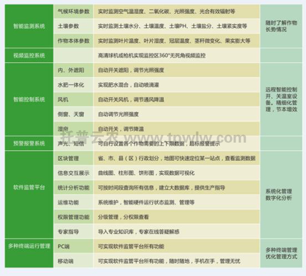 智能化温室拥有温室环境智能监控系统,可以准确地采集温室内大气温湿度、土壤温湿度、光照强度、溶液浓度、二氧化碳浓度、风向、风速以及作物生长状况等参数,将室内温、光、水、肥、气等诸多因素综合,根据不同作物、作物不同生长阶段对环境因子的不同要求,通过执行机构协调到最佳状态,节能最高可达50%,并有节水、节肥、节药的效果。