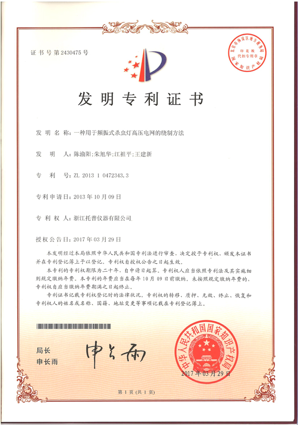 - 托普云农又喜获发明专利发表日期:2017-04-14 来源:托普云农 浏览次数:4397次近日,我司托普云农又喜获一项发明专利。据悉,该发明专利名称为“一种用于频振式杀虫灯高压电网的绕制方法”,发明专号为ZL201310472343.3。相较于传统的杀虫灯绕制方法,“一种用于频振式杀虫灯高压电网的绕制方法”是一种用专门设计的螺旋绕线机实现杀虫灯高压电网绕线的方法。该发明专利于2013年10月9日向国家知识产权局申请,并于2017年3月29日正式得到授权。据业内专家评价,该专利由于电网间距由螺杆螺距保证,使得绕制后的电网间距均匀一致。此外,绕制方法操作方便,绕制效率高且绕线紧致不易松落造成短路,具有良好的普及运用价值。