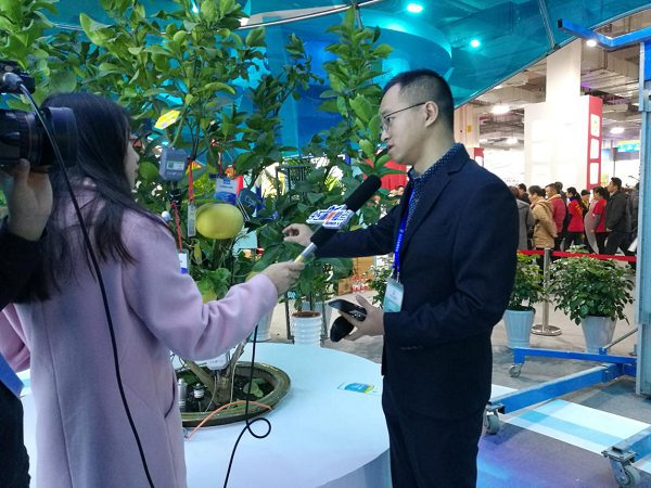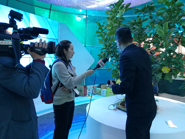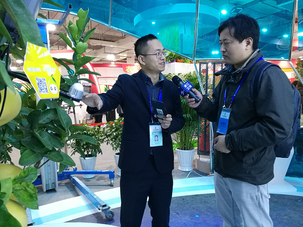 展会现场挂上传感器的文旦树“在这棵文旦树上,我们安装了无线叶面温度传感器、光照强度传感器、果实膨大传感器。通过这些传感器采集传输的数据,我们就能知道整个树的生长秘密”。展会现场,现代农业与信息化的互融发展,吸引浙江卫视、杭州电视台、萧山日报、舟山电视台、金华电视台等记者前来采访。
