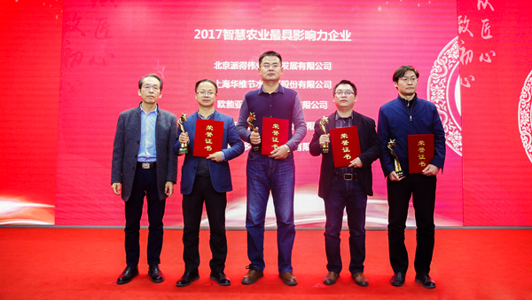 图:托普云农副总经理朱旭华(左二)代表公司上台领取2017智慧农业最具影响力企业当前智慧农业发展如火如荼,为满足智能感知、智能预警、智能决策、智能分析的需要,托普云农秉承开放、共享、融合、共赢的理念,与中国工程院孙九林院士、陈总懋院士就农业GIS及生长数据模型方面展开合作;与通讯运营商、农资企业共建了为农民服务的服务生态,与京东、阿里等电商品牌企业构建共赢模式的产业生态。通过与行业内的知名企业共创业务生态,赋能智慧农业发展。