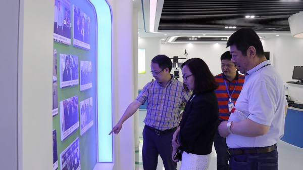 在托普云农的展厅里,朱副总经理向领导一行详细汇报了托普云农在数字农业农村方面取得的一些技术成果,及其在产业化应用探索上的成功案例。