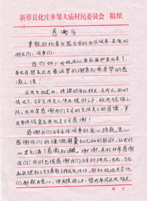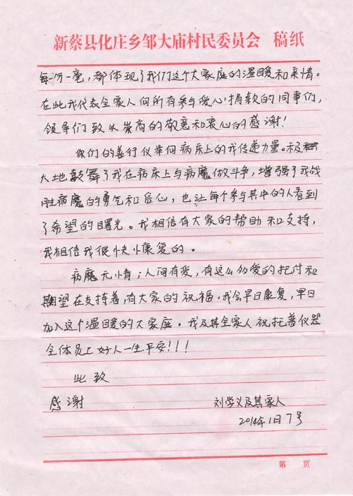 1月15日,公司收到刘学义写来的信,信中他告诉托普家人他的病情已好转,术后已由重症监护室转入普通病房,等待观察与休养。长长的一封信,给同事们带来了喜悦的消息,也倾诉着他对托普家人的深深谢意!