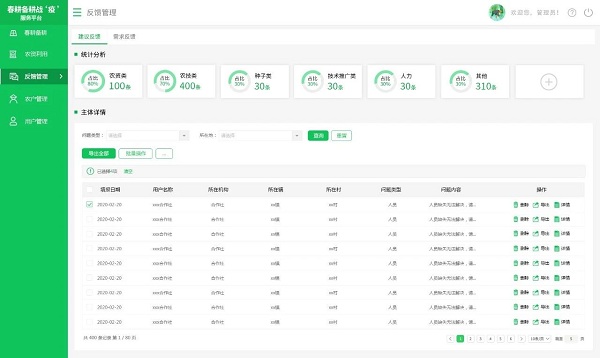 另外,平台还对相关的反馈信息进行了分类,有利于管理者进行统一处理,提升响应效率与资源综合利用率。春耕备耕PC端管理平台-反馈管理(效果图)