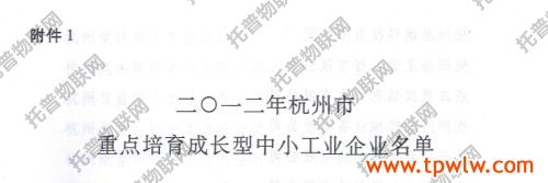 为进一步贯彻落实“实业兴市”战略,加快推进杭州市中小企业转型升级,保持工业经济平稳较快发展,按照《杭州市成长型中小工业企业五年培育计划》要求,杭州市经济和信息化委员会确定浙江托普仪器有限公司为2012年市重点培育成长型中小工业企业。
