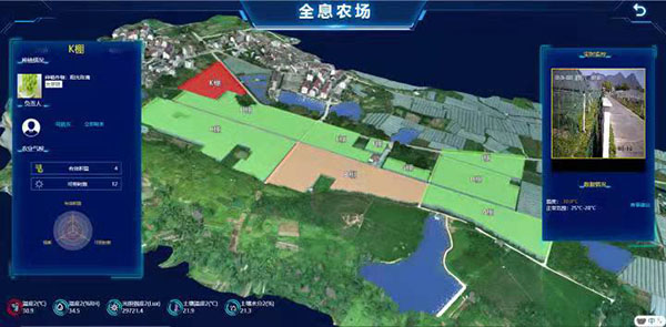 作为智慧农业的升级版本,“超级农场”项目对生产经营管理等每一个环节,都进行了严格的监管,数据采集,实时监测。通过无人机的航拍,实现了对整个农场的3D建模,把整个农场分成A—K,差不多11个区块,然后进行区块的数字化监控。一块电子显示屏就可看到农场的所有状况,葡萄园11个钢架大棚所有环境信息,包括温度、湿度、土壤酸碱值、光照等情况都呈现在屏幕上。另外,葡萄园里各处分布了多少摄像头,有多少在职人员,多少外来人员,也都能一目了然。