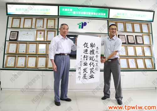 图为:陈部长为托普仪器题下十二字勉励之语:助推现代农业,促进行业发展