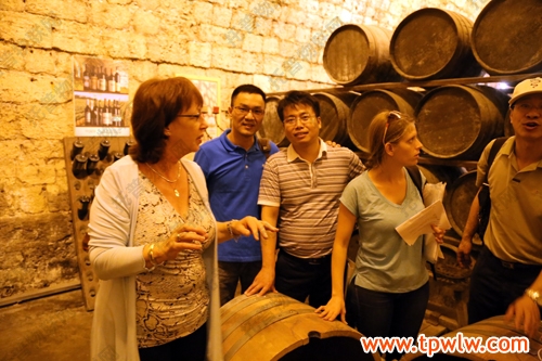 图为:托普仪器陈渝阳总经理(左二)随考察团参观葡萄酒厂