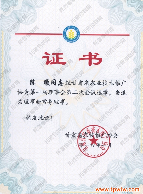 图为:托普仪器陈曦经理任甘肃省农业技术推广协会常务理事证书