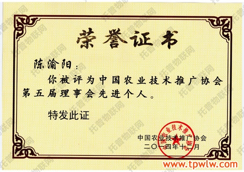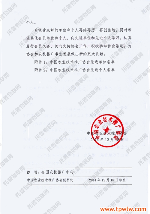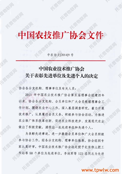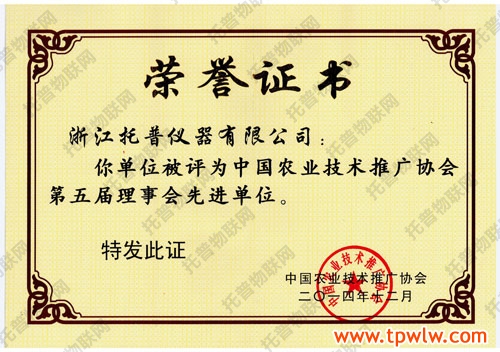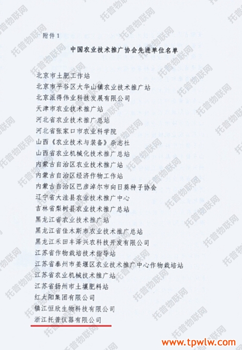 经逐级推荐及专家评审,在“中国农业技术推广协会关于表彰先进单位及个人的决定”中,托普仪器被评为“中国农业技术推广协会第五届理事会先进单位”,同时,公司陈渝阳总经理也被评为“中国农业技术推广协会第五届理事会先进个人”。