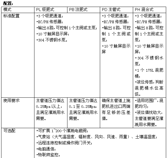 ? 采用文丘里注肥器,维修方便,最多可配8个;标配4个通道。单个文丘里吸肥通道吸肥量从50L/h—1000L/h。