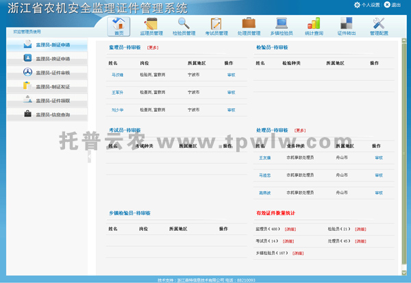 负责农机登记及驾驶证业务的管理工作,建立统一的农机监理业务计算机管理系统;依法确定注册登记农机的机型;负责考试员、检验员的考核、发证工作等。