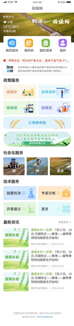 桐乡是浙北重要粮食生产基地,粮食总产稳定在13万吨以上,种植面积稳定在30万亩以上,种粮农户1.6万多户。生产过程中发现缺少快速服务入口、惠农政策申办繁琐、流程审批复杂以及找技术困难等问题?!疤锉D贰倍ㄎ辉谂┟褡罟匦牡摹耙患隆鄙?,包含土地、气象、农技、农资、农机、金融、保险、补贴等都是解决农民最着急的问题。通过“田保姆”的建设与管理,就是要实现精细化、动态化、标准化管理,通过建章立制、细化标准、优化流程,实现农户通过使用“田保姆”全程在线上政策补贴申请、流转、审核,能够充分有效利用现有资源,提高服务效率和水平。