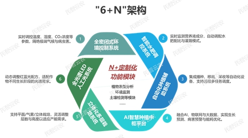 该方案基于"6+N"架构构建:全密闭式环境控制系统精准调控温湿度及CO?浓度,隔绝外界干扰;全光谱LED光系统动态调整红蓝光配方适配作物生长周期;立体栽培系统通过平面、多层、气雾模式灵活适配产能需求;智能水肥系统实时监测营养液成分并自动调配灌溉;自动化设备实现播种、移栽、采收全流程无人化操作;AI中枢整合物联网与大数据,提供生长预测与病害预警;另可扩展植物表型分析、环境监测等N个定制模块,形成闭环智能生产体系。